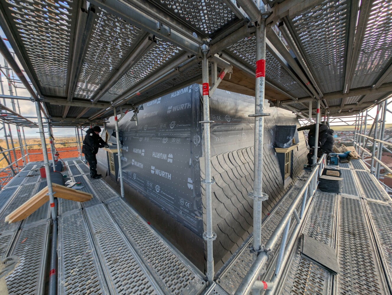 An der Turmhaube der Burg Weißensee kommen im Auftrag der Stiftung Thüringer Schlösser und Gärten (STSG) die Dachdecker gut voran. Bei Winterwetter arbeiten sie sich an dem 200 Quadratmeter großen geschwungenen Dach nach oben vor und verarbeiten rund 8 Tonnen Schiefer. Gearbeitet wird nach dem Prinzip der Altdeutschen Deckung. Bei dieser speziellen historischen Handwerkstechnik werden die Schieferplatten direkt am Dach nach Augenmaß bogenförmig zugerichtet, bevor sie aufgenagelt werden. Von unten nach oben nimmt die Größe der Platten schrittweise ab.