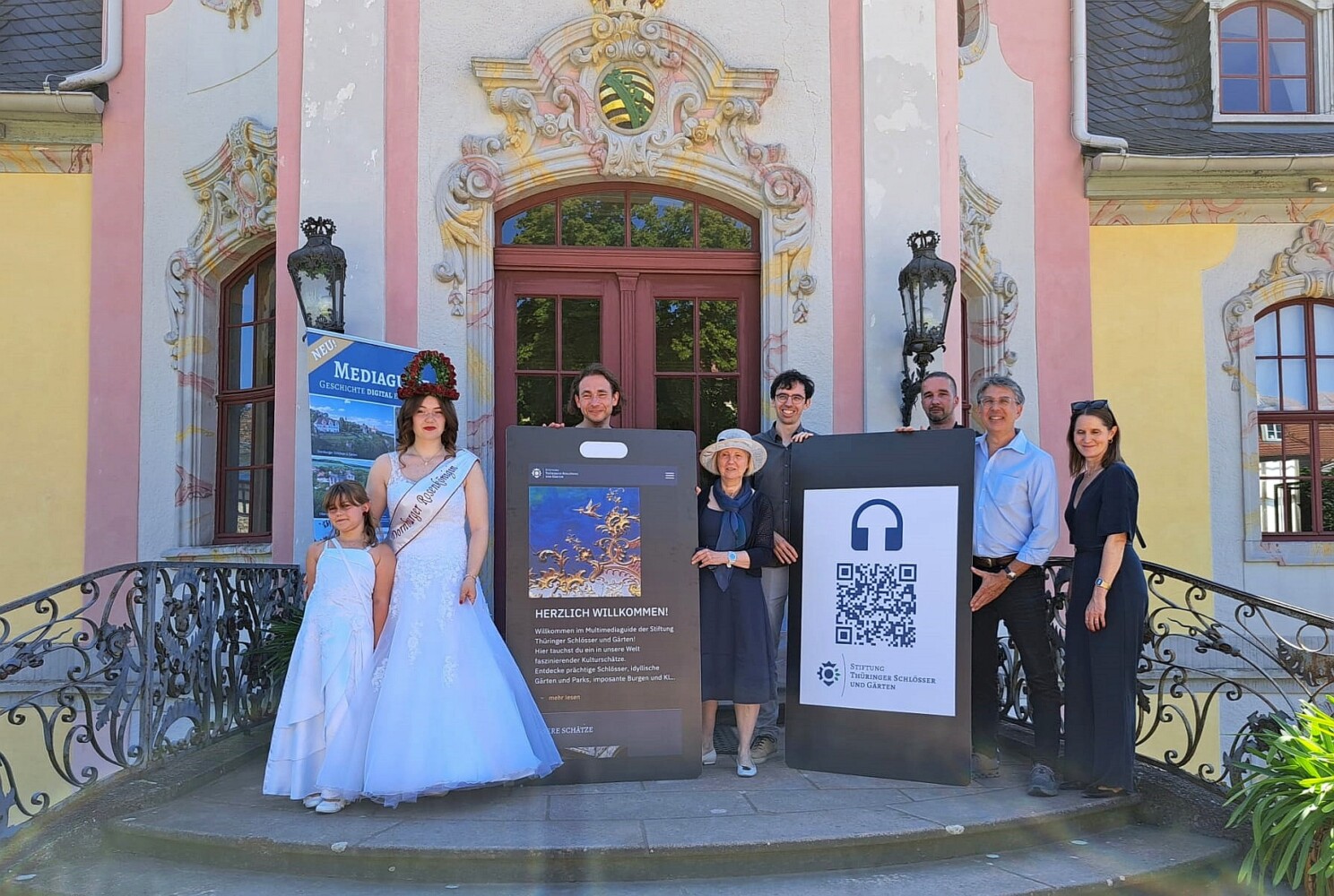Dr. Doris Fischer und Gordian Engel von der Stiftung Thüringer Schlösser und Gärten (beide Mitte) präsentieren gemeinsam mit der Dornburger Rosenkönigin Leonie Voigt (links) und Vertretern der beauftragten Agentur Micromovie den neuen Multimediaguide, Foto: STSG, Anke Pennekamp