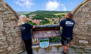 Petra Heyder und Marcel Müller vom Förderkreis Oberschloß Kranichfeld e.V. mit einer der neuen Orientierungstafeln, Foto: Florian Weida