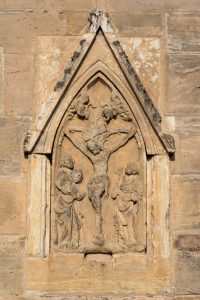 Im Tympanon über dem Südportal sind Reste einer Bemalung erkennbar – Maria mit Kind, begleitet von Engeln. Neben dem Portal befindet sich ein Kreuzigungsrelief aus der Zeit um 1370. Eine Inschrift an der Südwand erinnert an die Pesttoten von 1382. An der Südseite des ehemaligen Südostturms ist die gotische Ritzzeichnung eines sogenannten Schmerzensmanns erkennbar. Zwei Sonnenuhren zieren die Südwand des Querhauses. Eine weitere Sonnenuhr befindet sich an der Ostfassade.