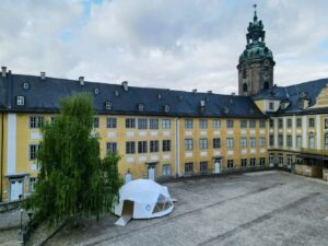 Abbildung: Im Hof von Schloss Heidecksburg in Rudolstadt wurde ein Info-Pavillon errichtet, Foto: STSG, Carolin Schart