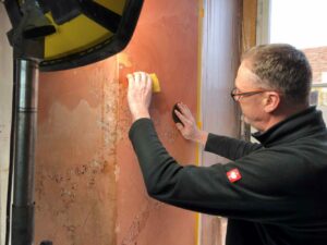 – Stuckrestaurator Marko Hersel bei einem Poliertest in den Säulensälen von Schloss Heidecksburg, Foto: STSG, Franz Nagel