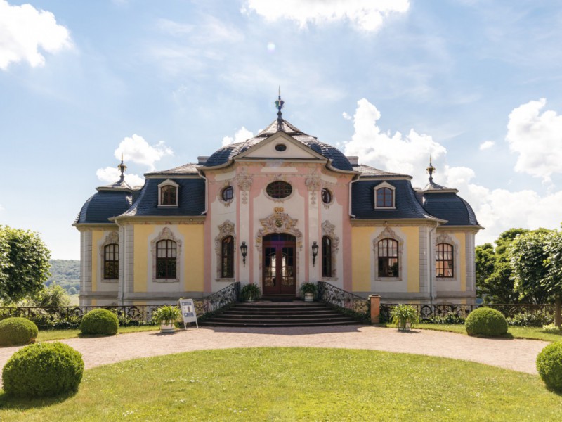 Um 1740 ließ Herzog Ernst August I. von Sachsen-Weimar-Eisenach das Rokokoschloss selbstbewusst in die Mitte des Dornburger Ensembles setzen. Es war eines von vielen Bauprojekten des absolutistisch regierenden Fürsten. Dornburg schätzte er vor allem wegen seiner nahegelegenen Jagdgebiete. Außerdem wollte er Kurfürst August dem Starken nacheifern und eine Heerschau nach dem Vorbild von dessen berühmtem Zeithainer Feldlager veranstalten. Dazu kam es zwar nie, jedoch erinnern die bastionsartigen Terrassen am Steilhang an diese Idee. Das Lustschlösschen nutzt die Hanglage phantasievoll aus. Die Geschosse sind direkt von den Gartenterrassen aus zugänglich – das Obergeschoss über eine elegant geschwungene Freitreppe. Dort spiegelt der Festsaal mit seinem Stuckmarmor in kräftigen Farben die barocken Herrscherambitionen des Bauherrn wider. In den seitlich angeordneten Appartements fanden später die schlichteren Vorstellungen des Klassizismus ihren Niederschlag. Den letzten Schliff gab Großherzog Carl Alexander ab 1875 dem Schloss. Er orientierte sich konsequent am Stil der Erbauungszeit und stattete den Speisesaal in Rokokoformen aus, um die viele seiner Zeitgenossen einen Bogen machten. Dort versammelte er eine Sammlung von Porzellanen aus China, den Niederlanden und Thüringer Manufakturen.