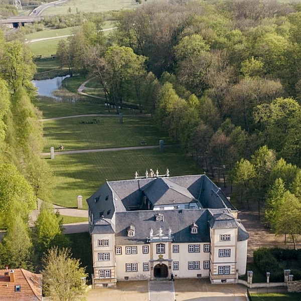 Den prächtigen Festsaal im Obergeschoss ließ der Graf mit Eichenholz täfeln und mit 33 Gemälden ausstatten. Sie zeigen unter anderem zwei seiner Förderer, Friedrich den Großen und Prinz Eugen von Savoyen. Im Festsaal ist auch die Devise des Eremitenordens der fröhlichen Einsiedler „Vive la joie“ (Es lebe die Freude), dem Gotter angehörte, gleich mehrfach zu lesen. Denn Gotter war nicht nur ein gewiefter und hoch dekorierter Diplomat, sondern auch ein Lebemann, der einen verschwenderischen Lebensstil pflegte. Berühmt waren die Tafeln, bei denen der Hausherr seinen Gästen seltene, teils wunderliche Speisen anbot. So soll er unter anderem Schüsseln voller Ringe, Ketten und Uhren herumgereicht haben – und jeder Gast konnte ein Erinnerungsstück auswählen. Der prächtige Marmorsaal diente dem Grafen als Empfangsraum und bildete den Auftakt zu dessen Paraderäumen. Ein dortiges Gemälde zeigt Gotter im Jagdgewand. Nach 14 Jahren musste der Graf das Anwesen schließlich verkaufen. Es ging an Herzog Friedrich III. von Sachsen-Gotha-Altenburg, der das Schloss in ein Kammergut umwandelte und den Wassergraben um das Schloss zuschütten ließ. Aus dem Jahr 1910 stammt das mondäne Marmorbad des Schlosses. Es ist eines der wenigen erhaltenen privaten Luxusbäder des frühen 20. Jahrhunderts. Es wurde von der damaligen Besitzerin, der Gräfin von Gneisenau, in Auftrag gegeben und mit grün geädertem Marmor gestaltet.