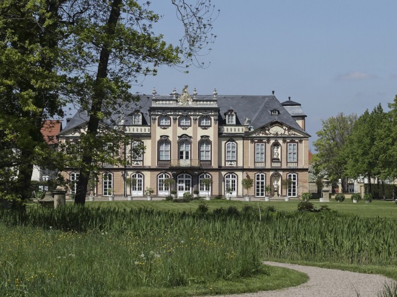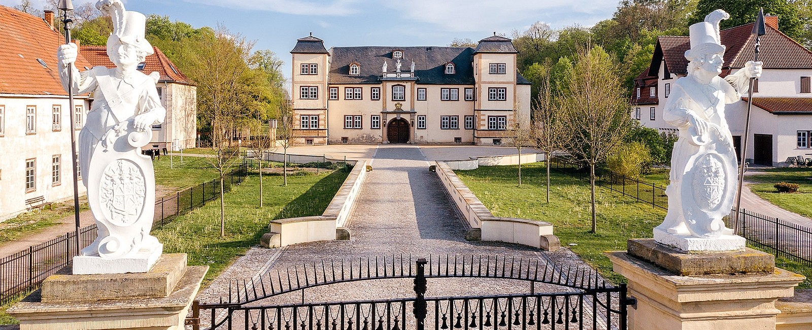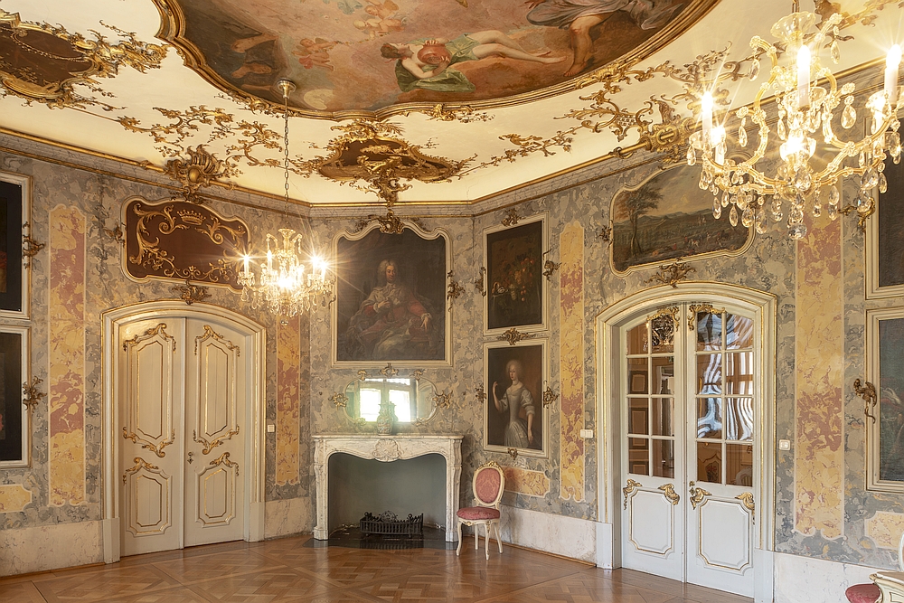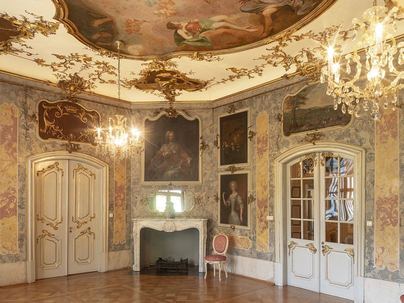 Den prächtigen Festsaal im Obergeschoss ließ der Graf mit Eichenholz täfeln und mit 33 Gemälden ausstatten. Sie zeigen unter anderem zwei seiner Förderer, Friedrich den Großen und Prinz Eugen von Savoyen. Im Festsaal ist auch die Devise des Eremitenordens der fröhlichen Einsiedler „Vive la joie“ (Es lebe die Freude), dem Gotter angehörte, gleich mehrfach zu lesen. Denn Gotter war nicht nur ein gewiefter und hoch dekorierter Diplomat, sondern auch ein Lebemann, der einen verschwenderischen Lebensstil pflegte. Berühmt waren die Tafeln, bei denen der Hausherr seinen Gästen seltene, teils wunderliche Speisen anbot. So soll er unter anderem Schüsseln voller Ringe, Ketten und Uhren herumgereicht haben – und jeder Gast konnte ein Erinnerungsstück auswählen. Der prächtige Marmorsaal diente dem Grafen als Empfangsraum und bildete den Auftakt zu dessen Paraderäumen. Ein dortiges Gemälde zeigt Gotter im Jagdgewand. Nach 14 Jahren musste der Graf das Anwesen schließlich verkaufen. Es ging an Herzog Friedrich III. von Sachsen-Gotha-Altenburg, der das Schloss in ein Kammergut umwandelte und den Wassergraben um das Schloss zuschütten ließ. Aus dem Jahr 1910 stammt das mondäne Marmorbad des Schlosses. Es ist eines der wenigen erhaltenen privaten Luxusbäder des frühen 20. Jahrhunderts. Es wurde von der damaligen Besitzerin, der Gräfin von Gneisenau, in Auftrag gegeben und mit grün geädertem Marmor gestaltet.