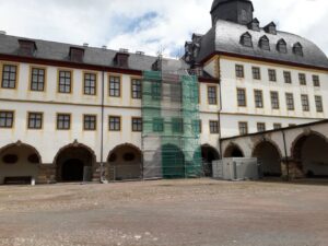 Abbildung: Schloss Friedenstein, Gerüst am Ostflügel zur Anlage von Musterflächen, Foto: Stiftung Thüringer Schlösser und Gärten, Sabine Jeschke