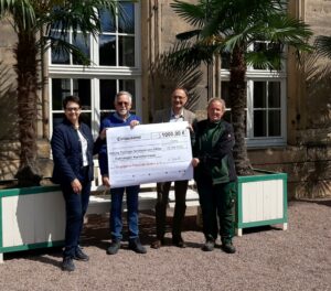 Sabine Ulrich und Uwe Ulrich vom Förderverein Orangerie-Freunde Gotha e.V. übergeben eine Spende von 1.000 Euro an Parkverwalter Jens Scheffler und Gärtnerin Anne Sydow von der Stiftung Thüringer Schlösser und Gärten, Foto: Stiftung Thüringer Schlösser und Gärten, Tino Weiland