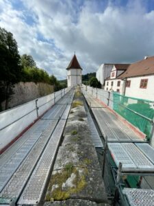 Abbildung: Eingerüstete Umfassungsmauern um Schloss Wilhelmsburg, Foto: STSG, Philipp Brand